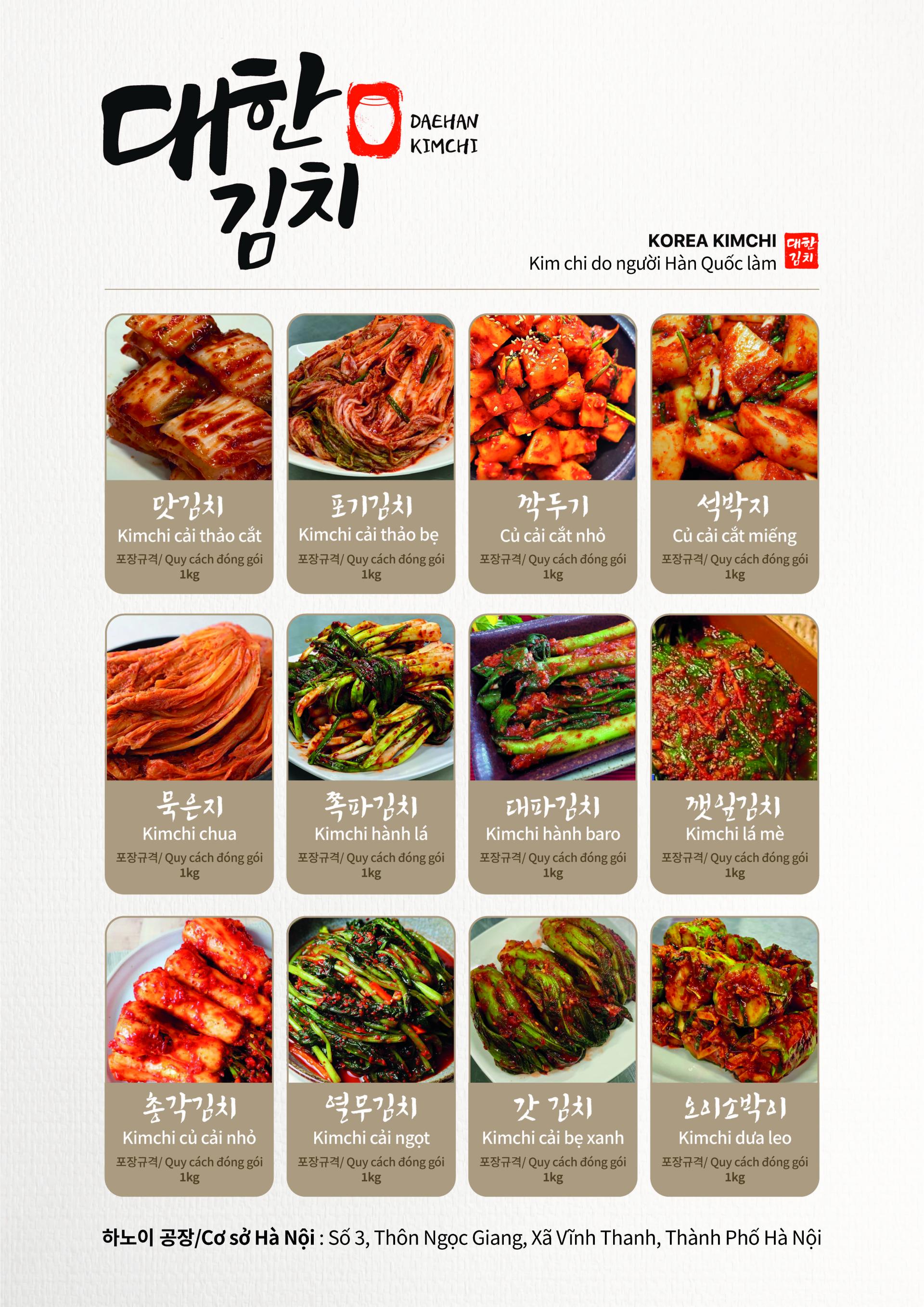 Quy cách đóng gói: đóng túi 5kg/loại, ( riêng kim chi lá mè đóng 1kg/túi)